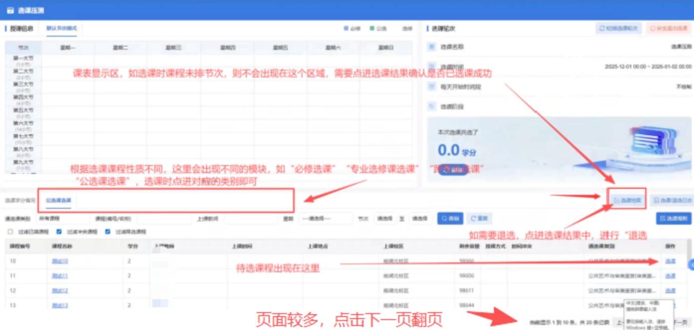 (三)对应的选课轮次名称为“2025-2026学年春季学期通识教育课和创新创业理论课(CL)选课”→页面下半部分待选区域,点击“公选课选课”,会出现课程(课程较多,可点击右下角页数翻页)→点击“选课”→点击“选课结果”确认已有课程,选课完成。