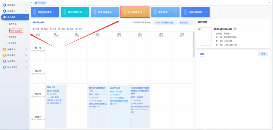2.选择“考试成绩--我的考试--考试安排查询”模块