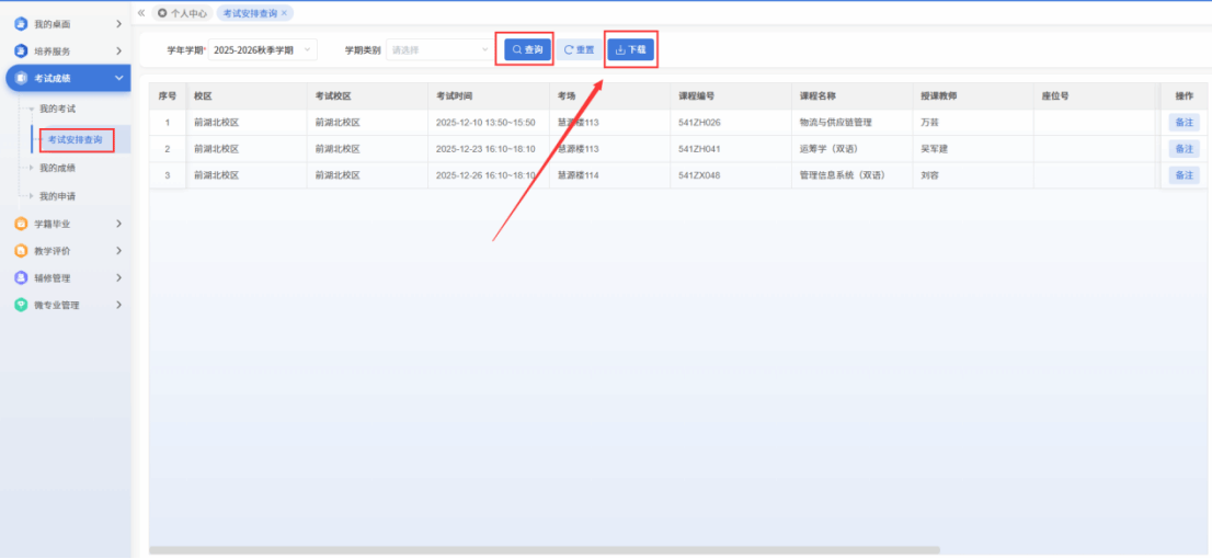 请各位同学将所查询的考试安排下载保存或打印,以便查询备忘自己的课程考试信息。各位同学务必看清每门考试科目考试地点和考试时间,并按时参加考试,祝广大同学期末考出好成绩!