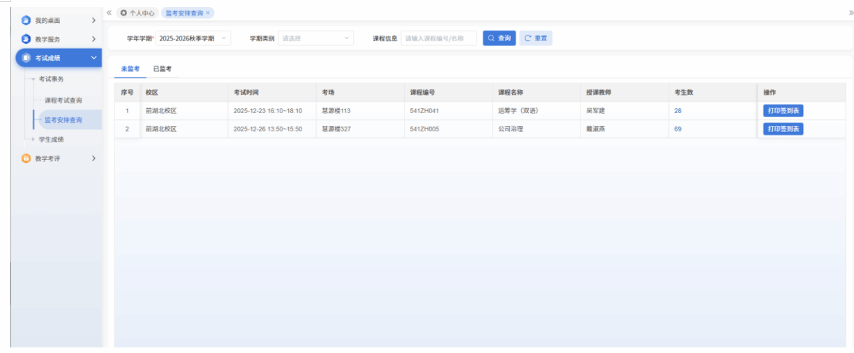 3.进入“监考安排查询”界面,默认查询结果为当前学期(2025-2026秋季学期)期末考试所有课程监考安排。如下图所示: