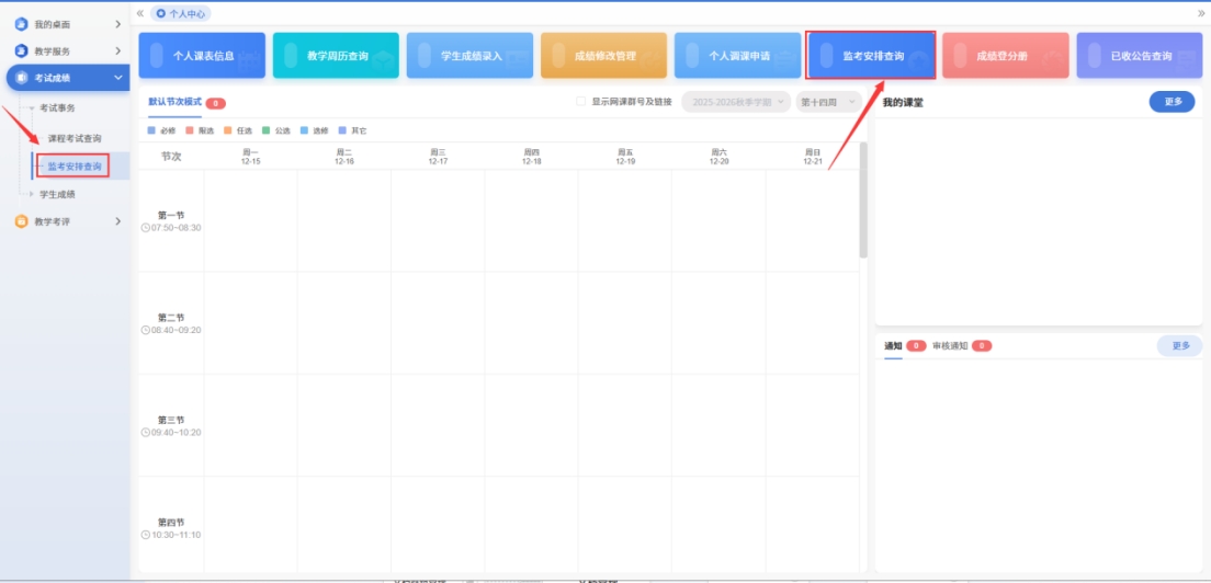 2.选择“考试成绩--考试事务--监考安排查询”模块