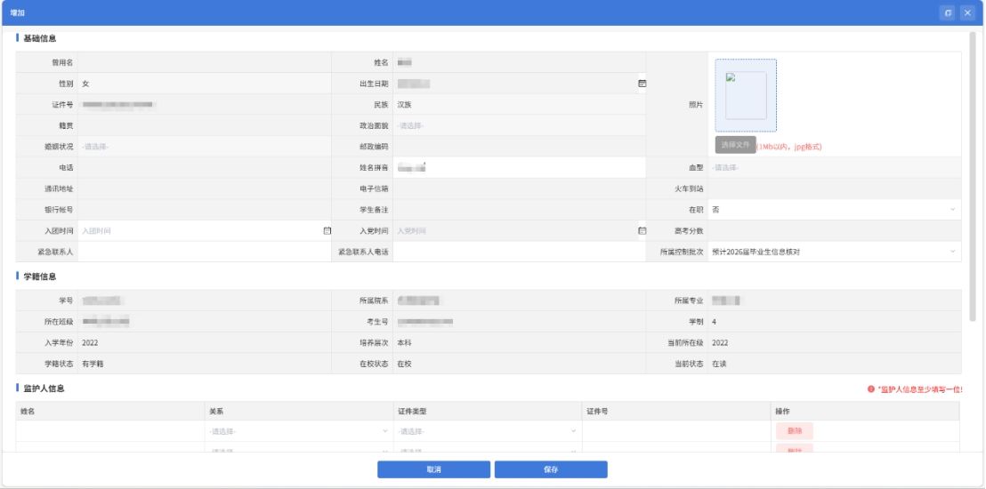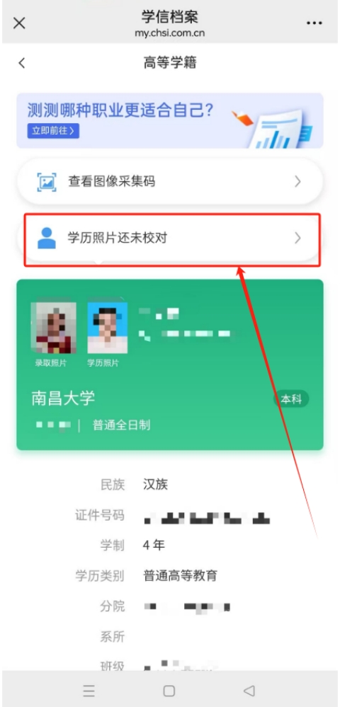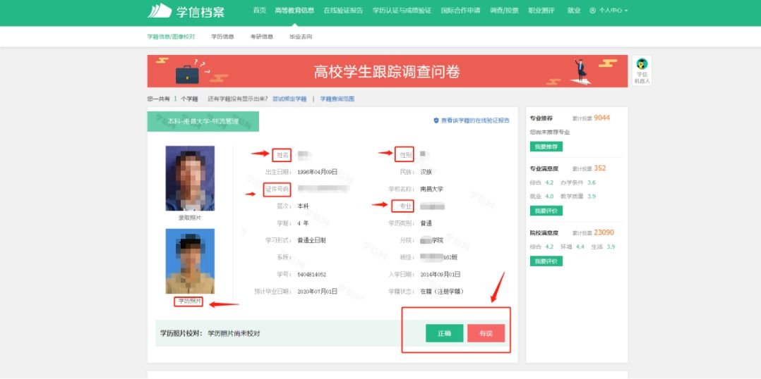 (3)学历照片有误:学历照片有误一般为错位,系由学生本人在信息采集时刷身份证与排队拍照顺序不一致导致,请与一同信息采集的同学一并核对,找到错位照片的几人,一同来学籍科进行修改。