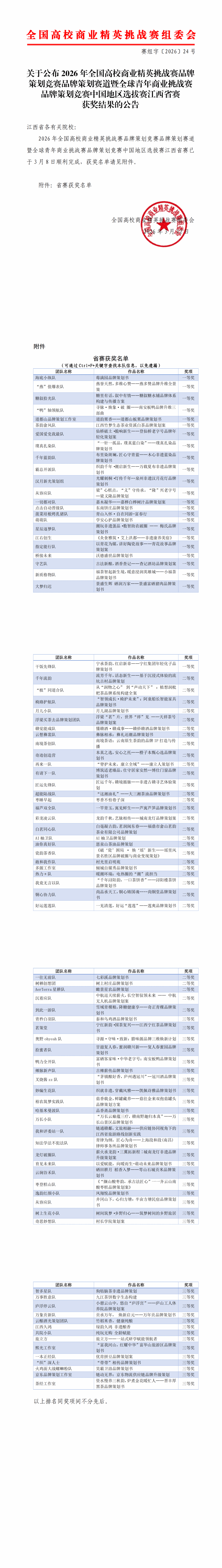 关于公布2026年全国高校商业精英挑战赛品牌策划竞赛品牌策划赛道暨全球青年商业挑战赛品牌策划竞赛中国地区选拔赛江西省赛获奖结果的公告.pdf